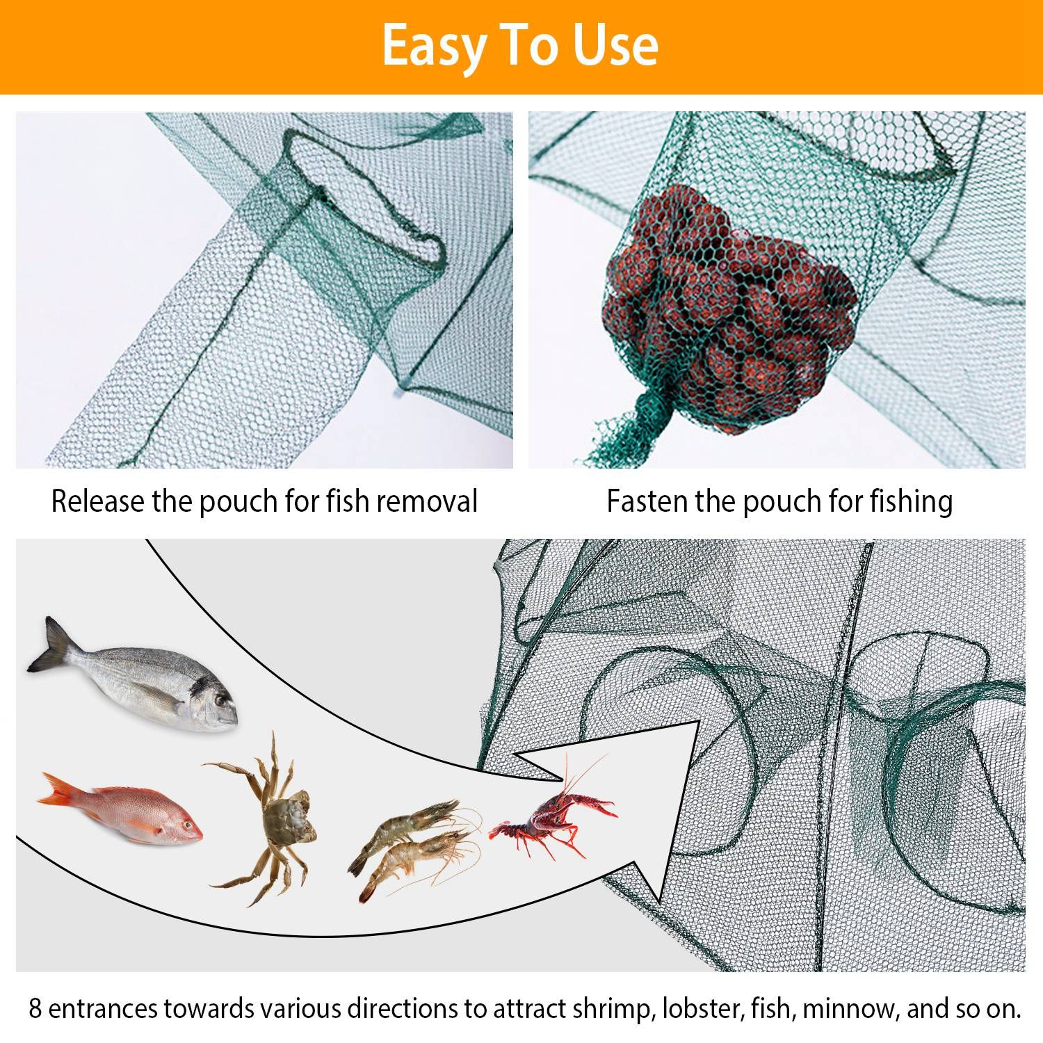 *360 Degree Catch*:8 Entrances sit at different directions; which can help catch smelt; eels; crab; lobster; minnows; shrimp and craw fish more efficiently. As for fish removal; just release the bait pouch and pour out fish.